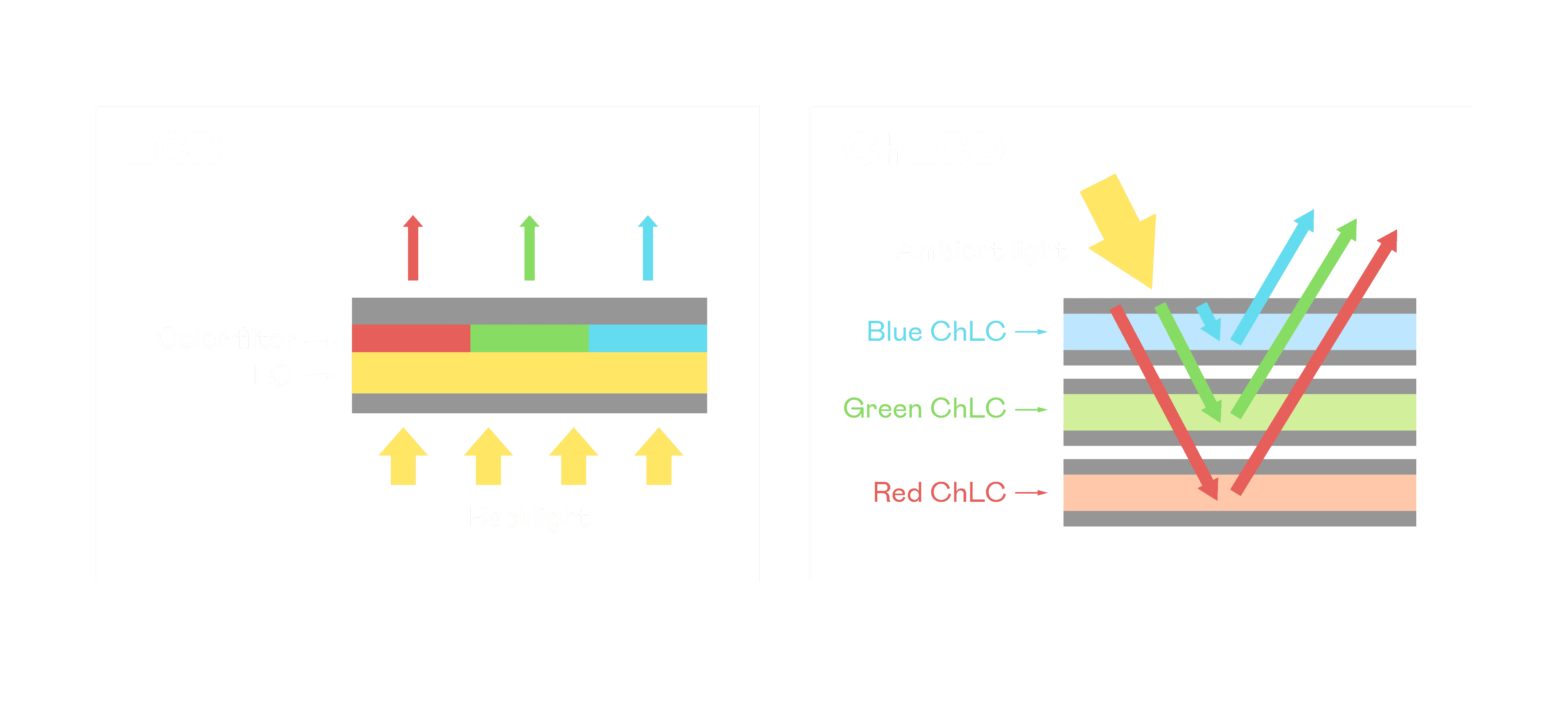 ChLCD 胆固醇液晶就如同纸张一样,,透过反射环境光来显示影像,,,,因此长时间观看不易造成人眼视觉疲劳,,可达到护眼效果。。。当处于户外阳光下使用,,,LCD 影像容易失真而不易观看,,,,但胆固醇液晶仍可维持较佳的影像品质。。