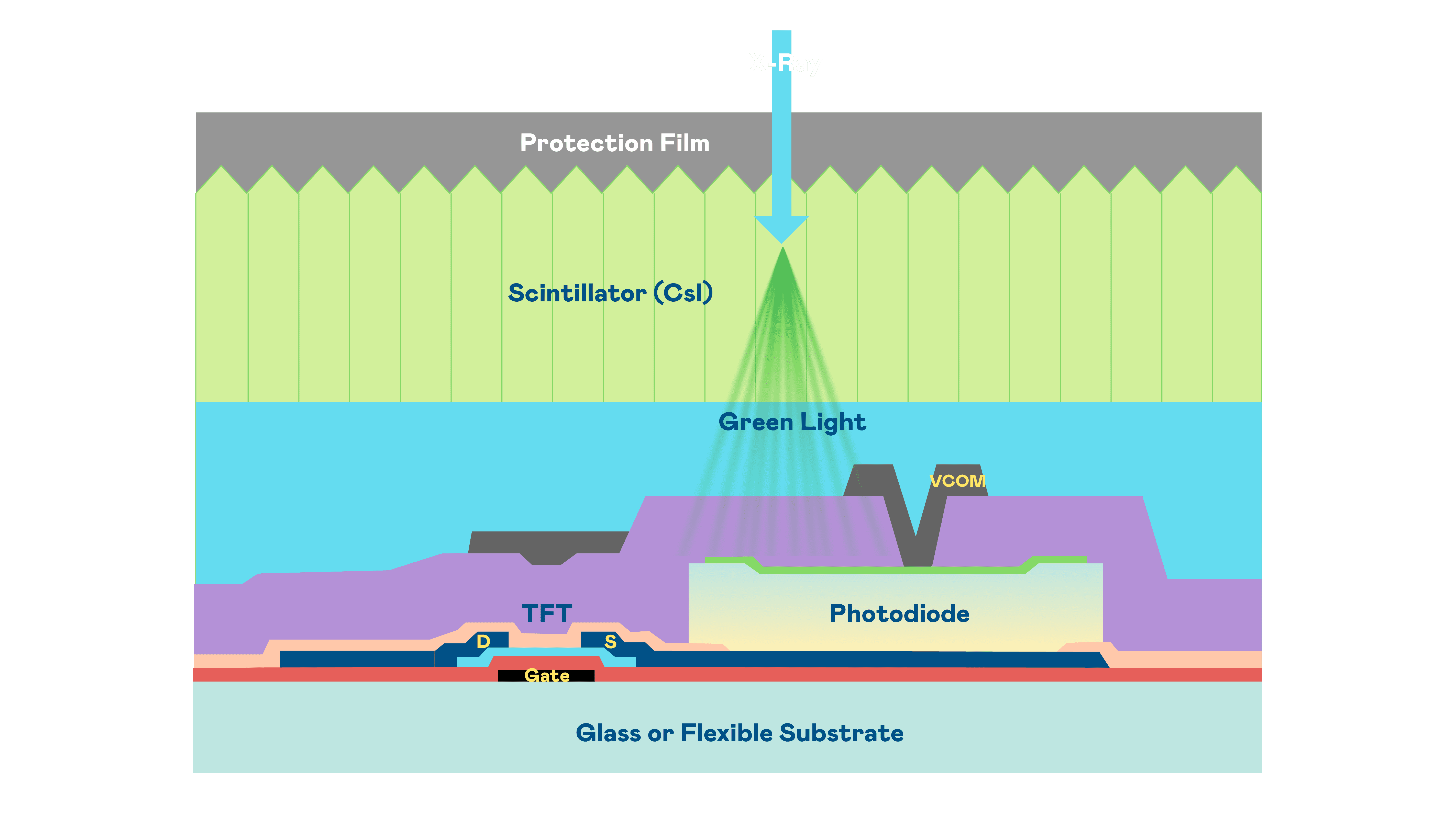 28国际的X光影像感测阵列使用薄膜电晶体 (TFT) 作为每个像素的读取开关,,,搭配光电二极体(Photodiode)的光电转换元件,,,,用以感测X光影像讯号。。。。